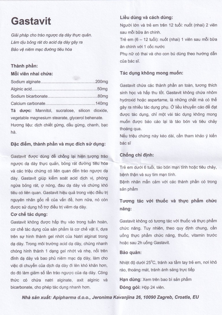 Viên nhai Gastavit Apipharma dùng cho trào ngược dạ dày thực quản (24 viên)