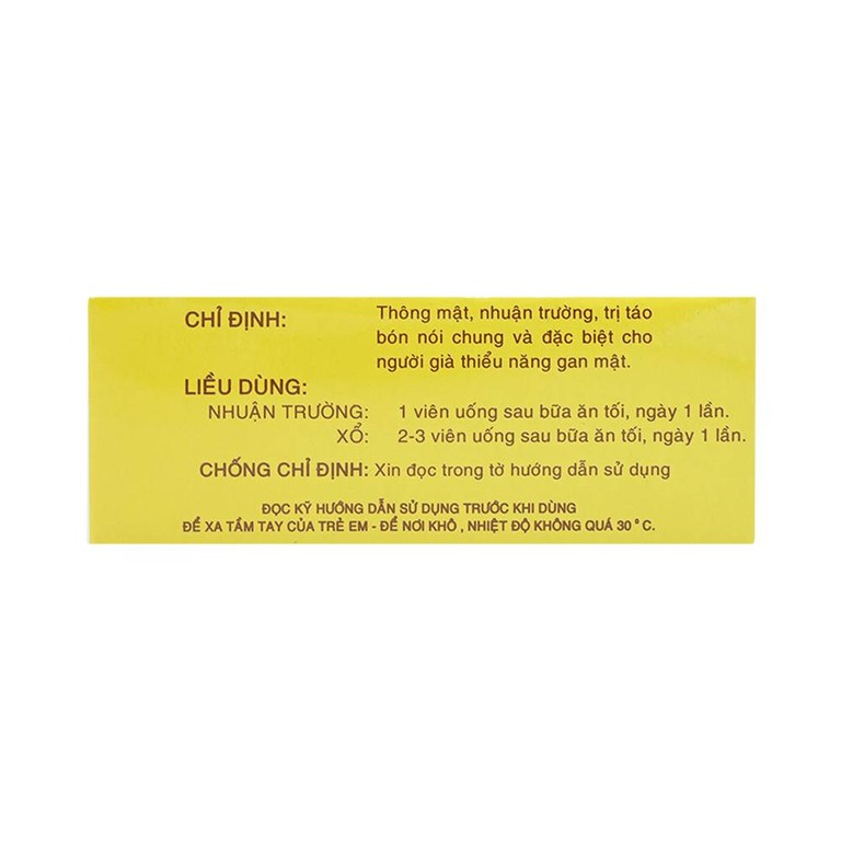 Liều dùng thông thường trong điều trị nhuận trường: 1 viên uống sau bữa ăn tối, ngày 1 lần.