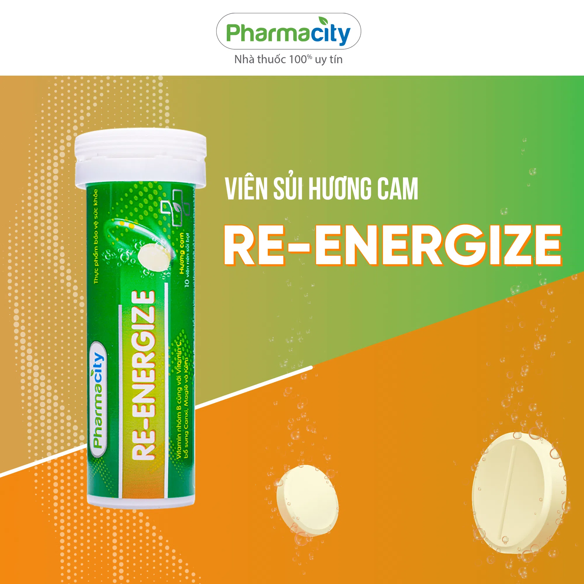 Viên sủi Pharmacity Re-Energize hương cam hỗ trợ tăng cường đề kháng (Tuýp 10 viên)Viên sủi Pharmacity Re-Energize hương cam hỗ trợ tăng cường đề kháng (Tuýp 10 viên)