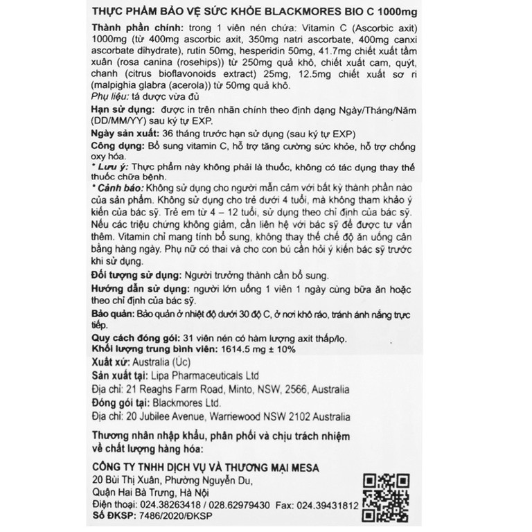 Viên uống Blackmores Bio C 1000mg bổ sung vitamin C, tăng cường sức khỏe (31 viên)SẢN PHẨM