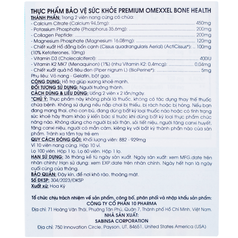 Bên cạnh việc duy trì lối sống lành mạnh và tập thể dục đều đặn, chế độ ăn uống khoa học với đầy đủ dưỡng chất cũng đóng vai trò quan trọng trong việc bảo vệ hệ xương. Viên uống Premium Omexxel Bone Health với các thành phần thiết yếu như canxi, vitamin D3, K2 MK7 là lựa chọn phù hợp cho các đối tượng có nhu cầu duy trì sức khỏe xương khớp. Ngoài ra, sản phẩm còn chứa các chiết xuất độc quyền như Collagen peptide, BioPerine, ActiCissus hỗ trợ xương chắc khỏe.