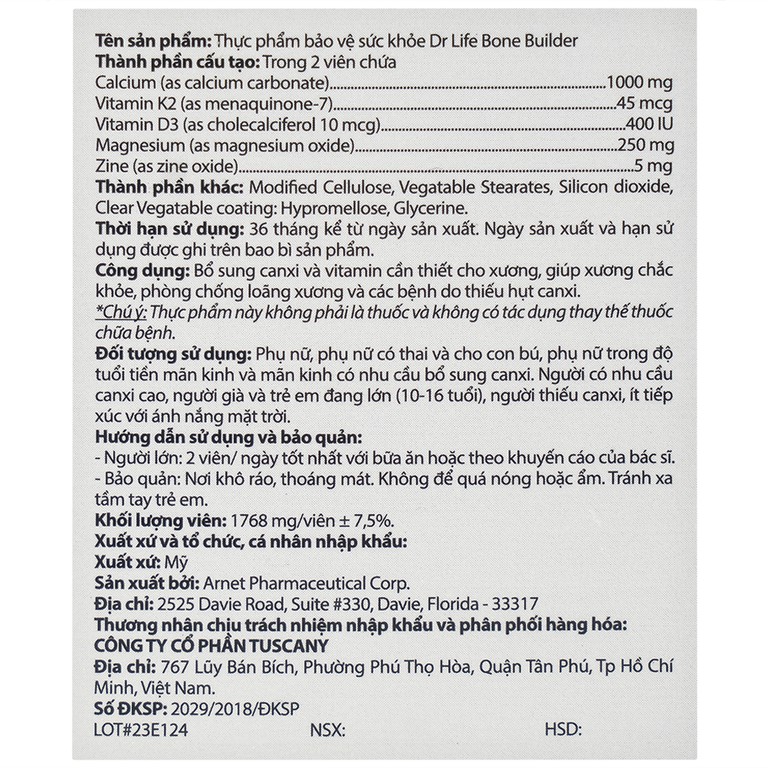 Bone Builder – Drlife là sản phẩm của Arnet Pharmaceutical Corp. USA, được sản xuất theo quy trình chuẩn GMP và đạt chứng nhận FDA Hoa Kỳ. Sản phẩm đảm bảo chất lượng theo tiêu chuẩn Mỹ, được nhập khẩu chính thức bởi Công ty Cổ phần Tuscany.