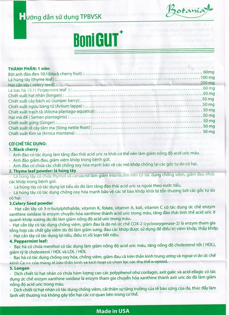 BoniGut+ có các thành phần thảo dược tự nhiên an toàn như lá húng tây, bạc hà, gừng, tầm ma, kim sa có tác dụng giúp giảm đau chống viêm. Các thành phần quả anh đào đen, chiết xuất hạt nhãn, hạt cần tây có tác dụng trung hòa và giúp ức chế sự hình thành acid trong máu. Nhóm trạch tả, mã đề, bách xù, ngưu bàng tử có tác dụng lợi tiểu làm tăng đào thải tinh thể acid ở trong khớp xương do đó làm giảm nồng độ acid uric có trong máu. Từ đó, sản phẩm BoniGut+ giúp chống viêm sưng, hạn chế acid uric và hỗ trợ điều trị bệnh gout hiệu quả.