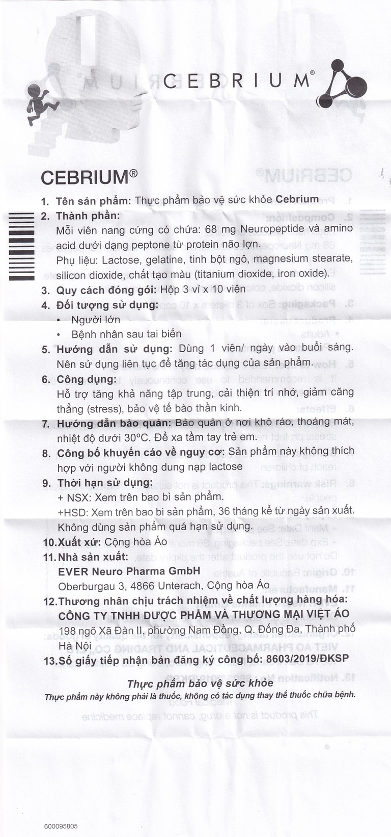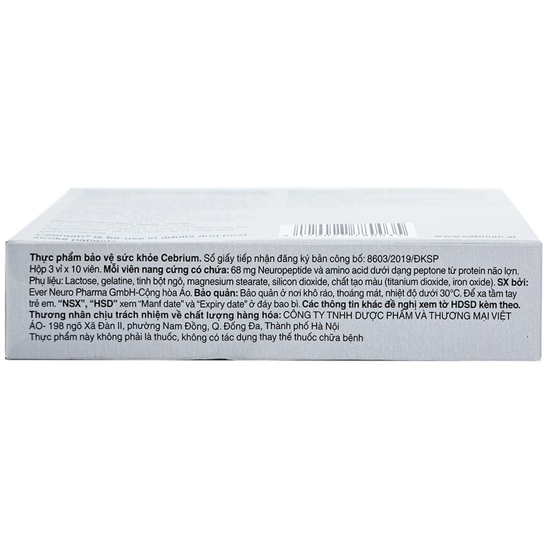 Cebrium là sản phẩm của EVER Neuro Pharma Gmbh – Công ty được đánh giá là một chuyên gia về dược phẩm thành công trong lĩnh vực thần kinh học và sản phẩm chuyên biệt. EVER Pharma luôn đặt trọng tâm kinh doanh chính vào nâng cao chất lượng cuộc sống và sự khỏe mạnh của bệnh nhân cũng như cả cộng đồng. Công ty tập trung vào lĩnh vực phát triển và sản xuất các liều thuốc vô trùng, đảm bảo các sản phẩm làm ra luôn đạt chuẩn chất lượng cao nhất.