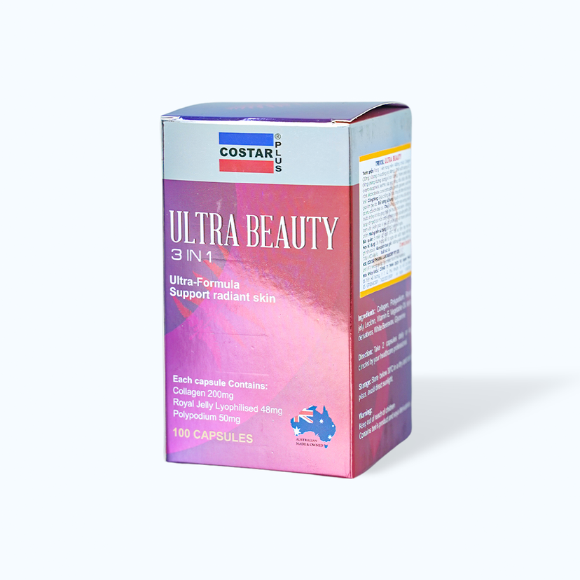 Viên uống Costar Plus Ultra Beauty 3 in 1 là một loại thực phẩm chức năng có tác dụng hỗ trợ làm đẹp da, chứa các thành phần dưỡng chất giúp cải thiện sức khỏe và vẻ ngoài của da.