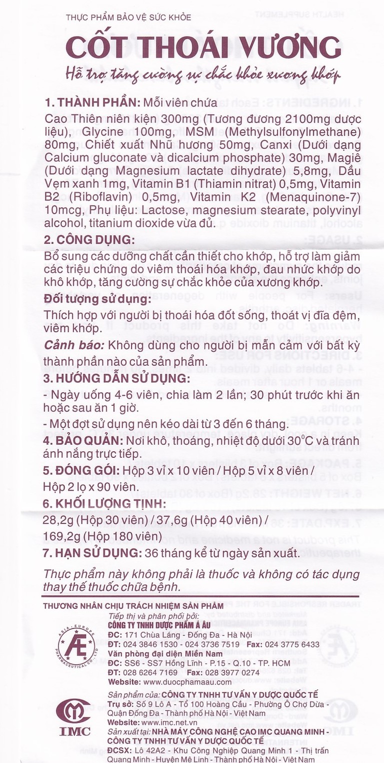 Cốt Thoái Vương là sản phẩm thuộc thương hiệu IMC. Một trong những doanh nghiệp tiên phong tại Việt Nam trong lĩnh vực nghiên cứu sản xuất thực phẩm chức năng được bào chế từ thảo dược, nguyên liệu quý từ thiên nhiên kết hợp với công nghệ hiện đại. Nhà máy sản xuất thực phẩm chức năng của IMC được trang bị dây chuyền sản xuất hiện đại, khép kín, tuân theo hướng dẫn nguyên tắc GMP trong sản xuất. Điều này giúp IMC đưa ra thị trường nhiều dòng sản phẩm chất lượng cao được kết hợp giữa y học cổ truyền và công nghệ hiện thế giới, để chăm sóc sức khỏe người tiêu dùng.