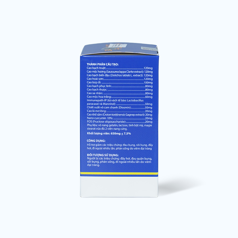 Sản phẩm được bào chế từ các thảo dược tự nhiên như Phục Linh, Bạch Truật, Trần Bì và Hoàng Cầm. Những thành phần này có tác dụng kháng viêm, làm dịu và bảo vệ niêm mạc ruột, hỗ trợ chức năng tiêu hóa và giảm các triệu chứng khó chịu như đầy hơi, đau bụng.