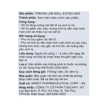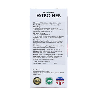 Lab Well Estro Her là thực phẩm chức năng, được dùng cho phụ nữ bị suy giảm nội tố, cũng như phụ nữ ở thời kỳ tiền mãn kinh và mãn kinh với các triệu chứng như khó chịu, bốc hỏa, sinh lý yếu,… Sản phẩm có xuất xứ tại Mỹ, đến từ Arnet Pharmaceutical Corp – Mỹ – nhà sản xuất thực phẩm chức năng hàng đầu thế giới. Với nhiều ưu điểm, chế phẩm là lựa chọn của nhiều người ở thị trường Mỹ và quốc tế.