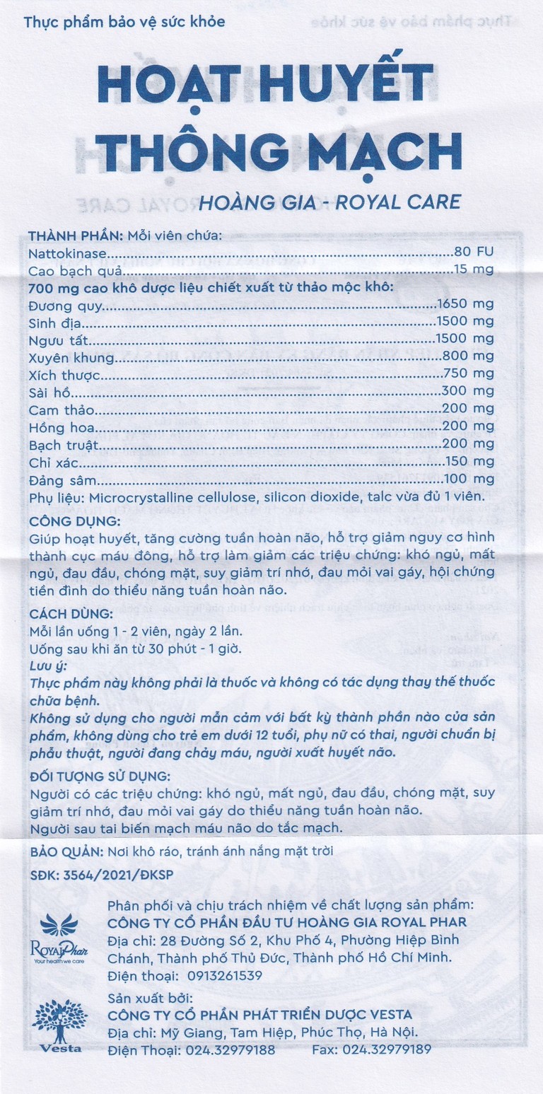 Hoạt Huyết Thông Mạch là sản phẩm của Hoàng Gia Royal Phar và được sản xuất tại nhà máy dược Vesta đạt chuẩn GMP, có nhiều năm kinh nghiệm trong lĩnh vực nghiên cứu và sản xuất các dòng thực phẩm chức năng bảo vệ sức khỏe. Vesta hiện đang cung cấp các dịch vụ: Nghiên cứu công thức, đăng ký số công bố, gia công sản xuất thực phẩm bảo vệ sức khỏe, thiết bị y tế. Với dây chuyền máy móc sản xuất hiện đại, nguồn nguyên liệu đầu vào chuẩn cùng đa dạng sản phẩm: Viên nang cứng, viên nén, viên hoàn, cốm, bột, siro,… Vesta đảm bảo sẽ mang đến cho khách những sản phẩm an toàn, chất lượng nhất.