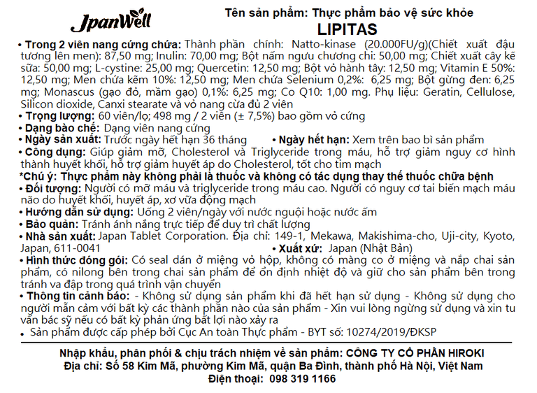 Viên uống Lipitas Jpanwell giúp giảm mỡ, cholesterol và triglyceride trong máu (60 viên)SẢN PHẨM