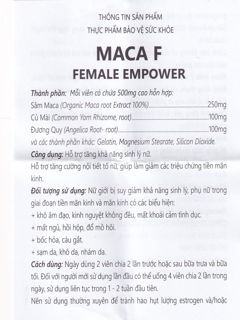 Maca F Female Empower là thực phẩm chức năng có thành phần từ thảo dược tự nhiên giúp tăng cường sinh lý nữ. Ưu điểm của sản phẩm này là có độ an toàn cao, lành tính và có khả năng hấp thu tốt. Nếu dùng đều đặn, Maca F Female Empower có thể hỗ trợ cân bằng nội tiết, tăng ham muốn và giảm nhẹ các triệu chứng rối loạn sinh lý như khô rát âm đạo, giảm ham muốn, mệt mỏi, rối loạn kinh nguyệt,…
