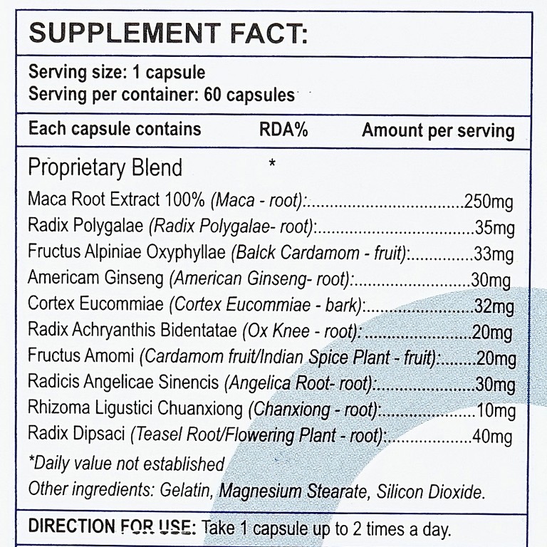 Dược tính Maca M Male Power được gia giảm từ các loại thảo dược quý như: maca, viễn chí, ích trí nhân, nhân sâm, đỗ trọng, ngưu tất mang lại khả năng cải thiện hệ trục nội tiết não bộ (vùng dưới đồi) – tuyến yên – tuyến thượng thận, đồng thời nâng cao độ dẻo dai và chức năng miễn dịch. Nhờ đó giúp tăng cường chức năng của thận, hỗ trợ điều trị phong khu từ thấp, tráng dương, giảm tình trạng tiểu đêm nhiều lần, tay chân nhức mỏi ra mồ hôi lạnh, đau lưng.