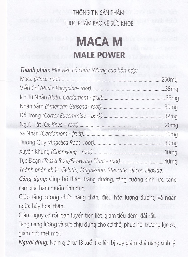 Maca M Male Power giúp bổ thận, tráng dương, tăng cường sinh lực, tăng cảm xúc ham muốn tình dục.
