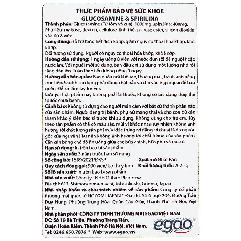 Thành phần của Viên uống Orihiro Glucosamine and Spirulna