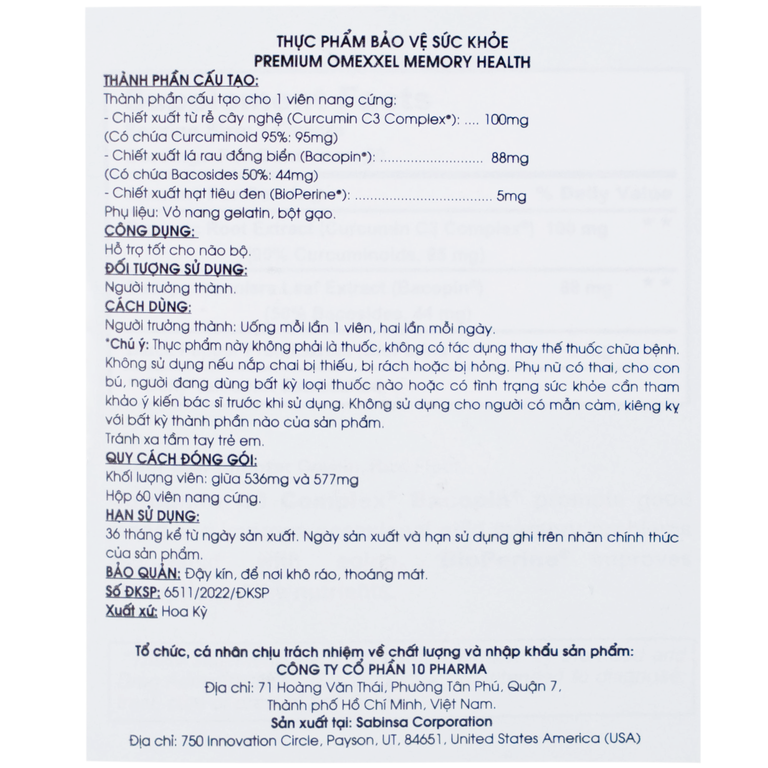Premium Omexxel Memory Health là sản phẩm hỗ trợ cải thiện trí nhớ đến từ Hoa Kỳ. Thành phần nổi bật trong sản phẩm này là Bacopin®, đã được nghiên cứu và xác nhận giúp cải thiện trí nhớ, lo âu và một số vấn đề sức khỏe thần kinh khác. Bacopin® được chiết xuất từ lá rong biển và hạn chế tác dụng phụ tới mức tối thiểu so với các loại thuốc tâm thần khác.