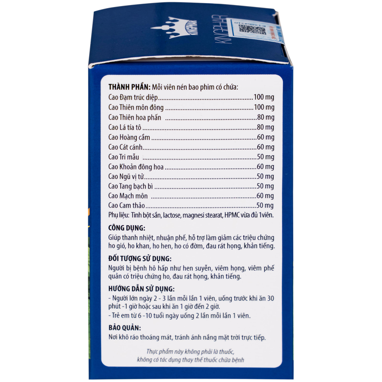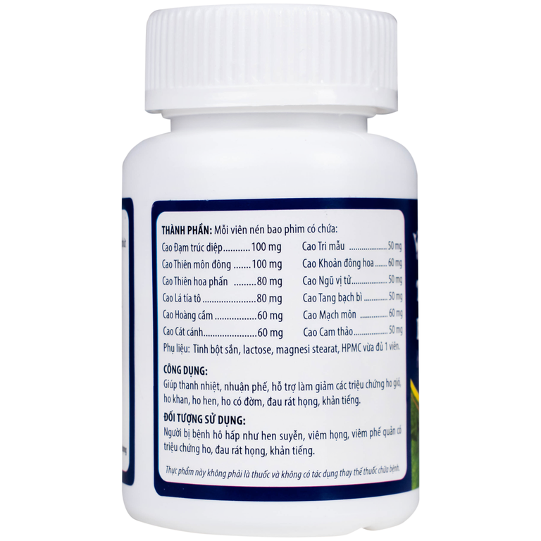 Viên uống được chiết xuất hoàn toàn từ 100% thảo dược có nguồn gốc thiên nhiên, trải qua quá trình lựa chọn và kiểm tra nghiêm ngặt từ khâu nguyên liệu đến thành phẩm nên hoàn toàn an toàn cho sức khỏe. Sự kết hợp của 12 dược liệu trị bệnh hô hấp mạn tính đã được lưu truyền từ ngàn đời, không chỉ hỗ trợ giảm triệu chứng, phần ngọn của bệnh (giảm ho nhanh, hóa đờm hiệu quả), mà còn giúp bổ phế, nâng cao thể trạng, cải thiện phần gốc của bệnh.