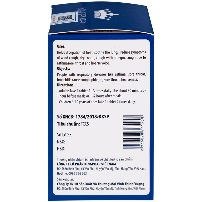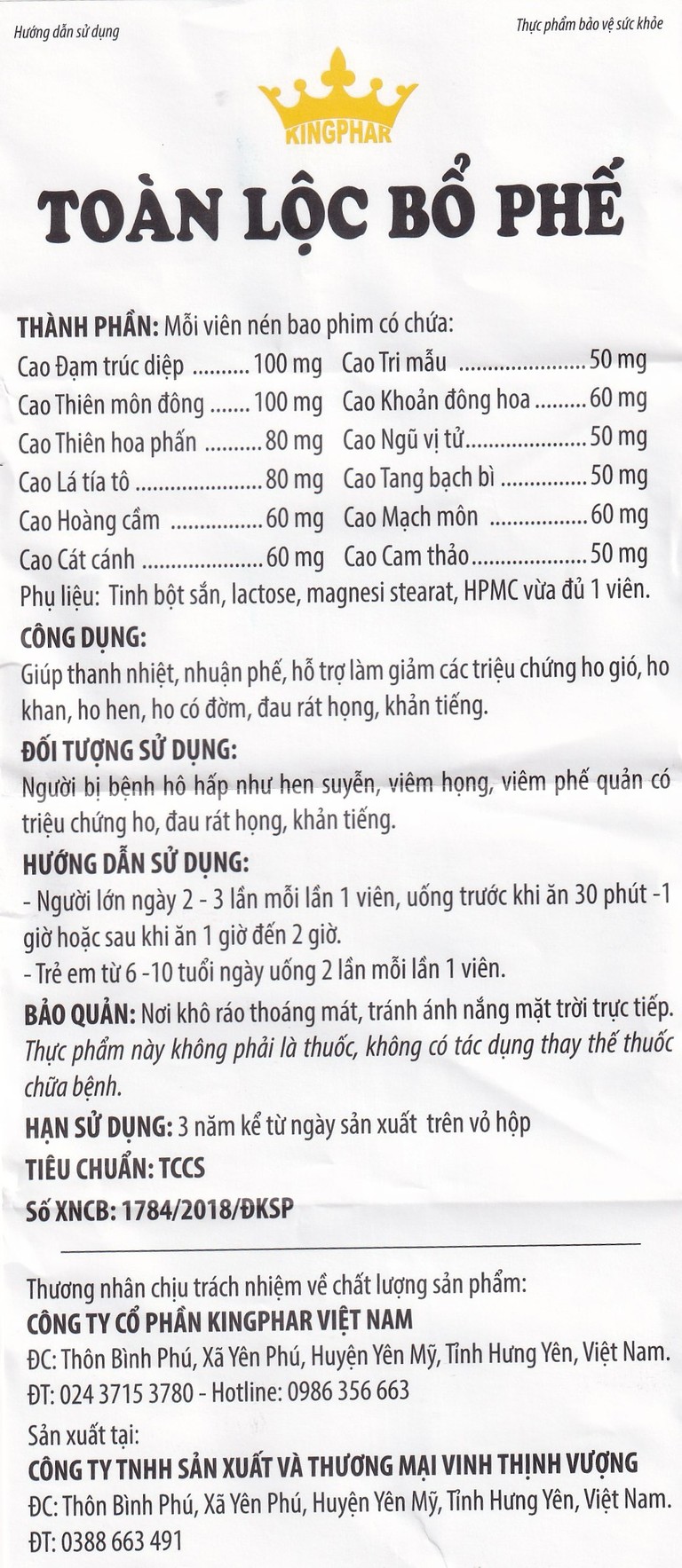 Viên uống Toàn Lộc Bổ Phế Kingphar giúp thanh nhiệt, nhuận phế (60 viên)SẢN PHẨM