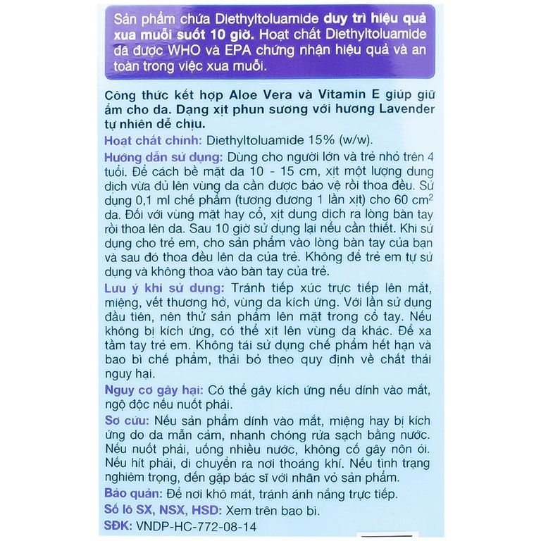 Xịt chống muỗi Remos hương Lavender với hoạt chất Diethyltoluamide 15% đã được WHO và EPA chứng nhật hiệu quả và an toàn trong việc xua muỗi, đảm bảo không gây hại khi sử dụng trên da nếu bạn dùng đúng cách.