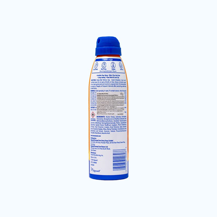 Alcohol Denat., Isobutane, Homosalate, Octocrylene, Benzophenone-3, Ethylhexyl Salicylate, Butyl Methoxydibenzoylmethane, Acrylates/ Octylacrylamide Copolymer, Diethylhexyl Syringylidenemalonate, Parfum, Caprylic/Capric Triglyceride, Caprylyl Glycol, Paraffinum Liquidum, PEG-8 Dimethicone, Limonene, Hexyl Cinnamal, Linalool, Amyl Cinnamal, Alpha Isomethyl Ionone, Tocopheryl Acetate, Silica, Retinyl Palmitate, Octyldodecanol, Aloe Barbadensis Leaf Extract, Geraniol, Sodium Propoxyhydroxypropyl Thiosulfate Silica [Nano], Ascorbic Acid