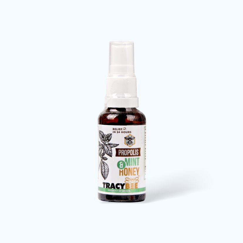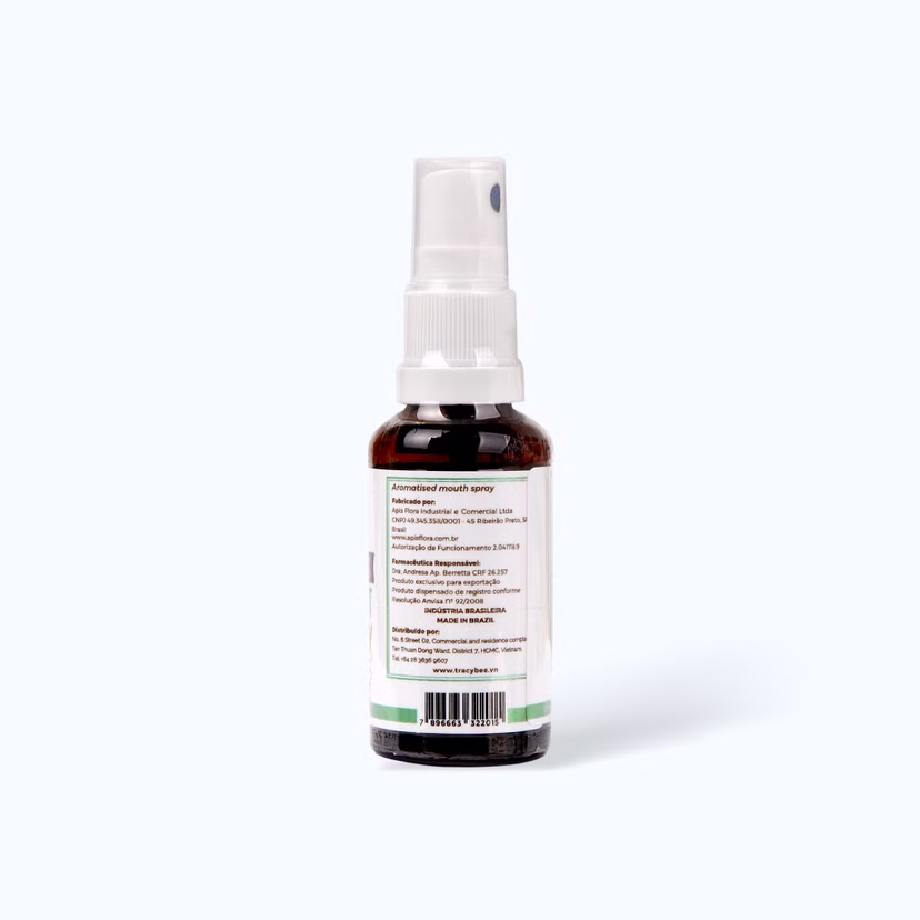 Xịt keo ong xanh vị bạc hà Tracybee được sản xuất bởi APIS FLORA INDUSTRIAL E COMERCIAL,LTDA. sản phẩm là thực phẩm chức năng hỗ trợ giảm ho kéo dài, giúp nâng cao sức đề kháng, bổ sung kháng thể tự nhiên của keo ong. Sản phẩm giúp hạn chế quá trình oxy hóa, kháng khuẩn trong khoang miệng và đường hô hấp, hỗ trợ điều trị các triệu chứng viêm họng, ho, cảm cúm.