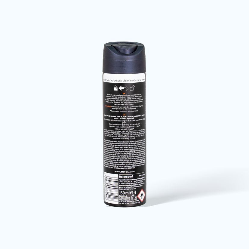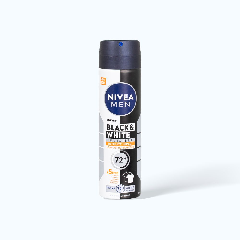 Xịt khử mùi Nivea Men Anti-Perspirant Black and White Invisible là sản phẩm khử mùi dạng xịt dành cho nam giới, giúp giảm tiết mồ hôi và ngăn mùi hiệu quả đến 48 giờ. Sản phẩm còn giúp giảm hình thành vệt ố vàng trên áo, đã được kiểm nghiệm da liễu và an toàn cho da nhạy cảm.
