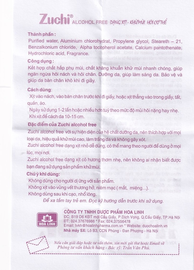 Thành phần của Xịt khử mùi Zuchi Hoa Linh