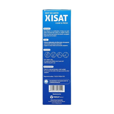Chai xịt mũi Xisat người lớn với thành phần nước biển sâu thiên nhiên tinh chiết từ độ sâu 450m, giàu muối và khoáng chất như Cu2+, Zn2+… có tính kháng khuẩn, kháng viêm, săn se niêm mạc. Sản phẩm dạng phun sương siêu nhỏ, dễ dàng đi sâu vào khoang mũi giúp làm sạch dịch nhầy và các tác nhân gây bệnh.