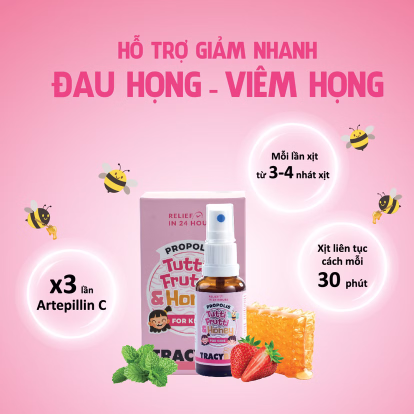 Keo ong xanh Tracybee Propolis Tutti Frutti & Honey là sản phẩm hỗ trợ giảm ho, viêm họng cho trẻ em. Sản phẩm chứa keo ong Brazil quý hiếm và các dưỡng chất tự nhiên, giúp kháng khuẩn cho đường hô hấp, tăng cường hệ miễn dịch, và ngăn chặn vi khuẩn gây hại. Sản phẩm có cơ chế xịt phun sương, giúp phân tán đều và len lỏi vào các niêm mạc họng.