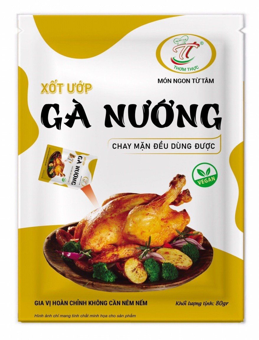 Gà để cả con hoặc 1/2 con ướp với 01 gói xốt Thơm Thực 80g trong 30 phút, Xếp gà lên lò nướng điện, nướng ở nhiệt độ 175 khoảng 15 phút, trở mặt gà và quết xốt ướp tiếp tục nướng thêm khoảng 15 phút đến khi gà vừa ngả vàng là dùng được.